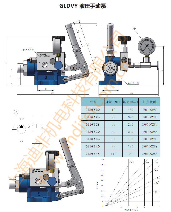 GLDVY系列液壓手動(dòng)泵是雙作用液壓手動(dòng)泵,在推和拉的過程中都產(chǎn)生排量,壓力范圍:90-460bar,最大排量可達(dá)111ml/行程來回。該系列的手動(dòng)泵是在GL系列手動(dòng)泵的基礎(chǔ)上,通過外接閥塊擴(kuò)展而來,閥塊內(nèi)置了安全溢流閥、截止閥、單向閥和壓力表,可實(shí)時(shí)觀看液壓泵的壓力。可將卸油口通過油管與吸油口相連,訂貨時(shí)請(qǐng)聯(lián)系廠家。