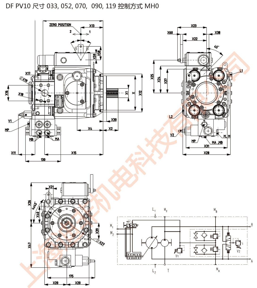 DF PV10系列變量軸向柱塞泵采用斜盤式設(shè)計(jì),適用于靜液傳動(dòng)的閉式液壓回路。流量與泵的排量和轉(zhuǎn)速成比例關(guān)系,改變斜盤的角度可以使排量在0和最大排量之間變化。標(biāo)準(zhǔn)泵內(nèi)部配有G轉(zhuǎn)子式補(bǔ)油泵,高壓端口配有沖洗閥和雙溢流閥,溢流閥對(duì)靜液傳動(dòng)系統(tǒng)提供過載保護(hù)。標(biāo)準(zhǔn)泵配帶機(jī)械反饋的機(jī)械液壓伺服閥。殼體及軸端由密封件保證密封性能,最大壓力為0.25Mpa(間歇壓力為0.5Mpa).