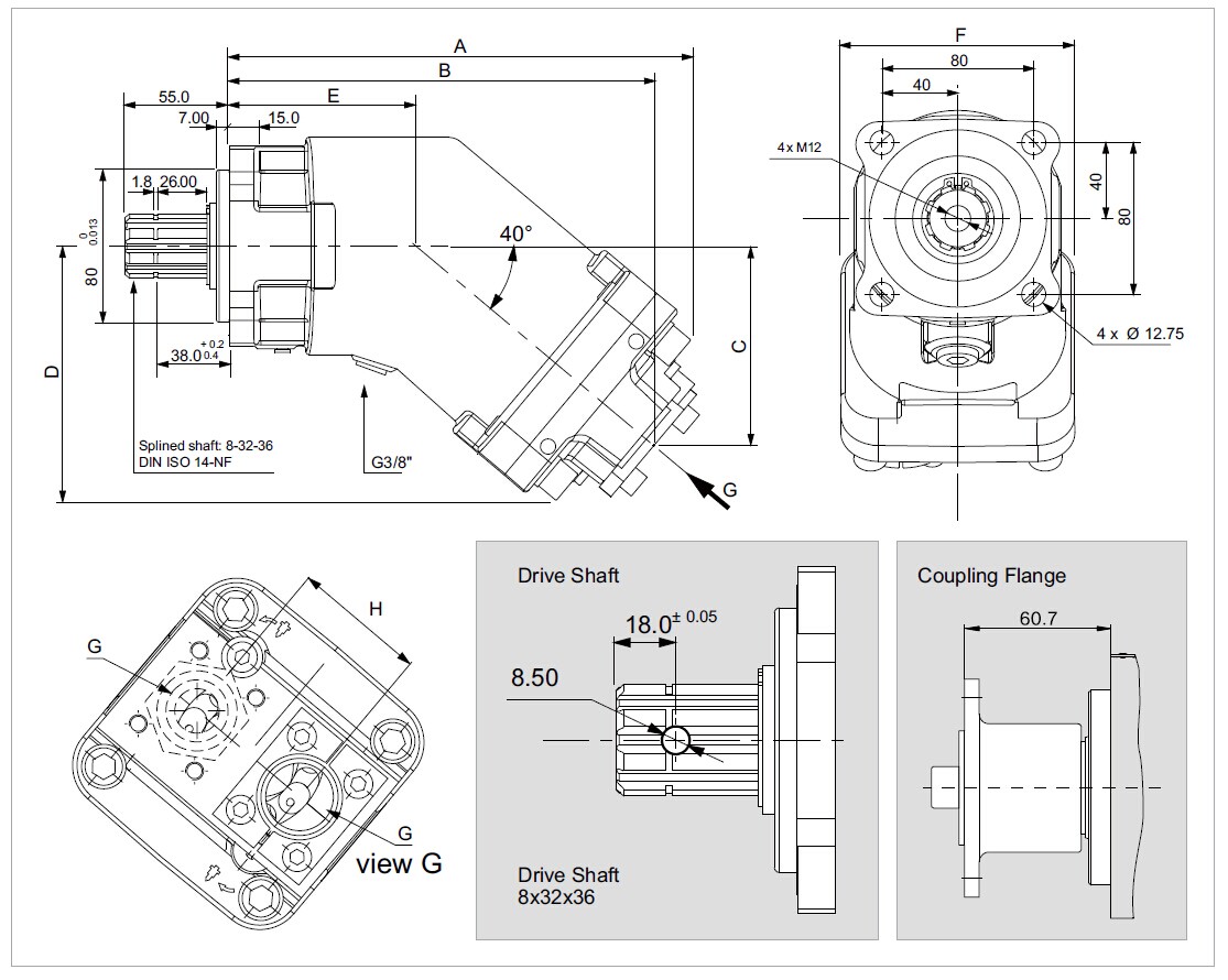2PBA系列斜軸柱塞泵,采用40度斜軸設計,排量12cc-108cc,最高壓力可達400bar,ISO法蘭連接,花鍵8×32×36 DIN ISO 14-NF。具體參數(shù)及尺寸如下:
