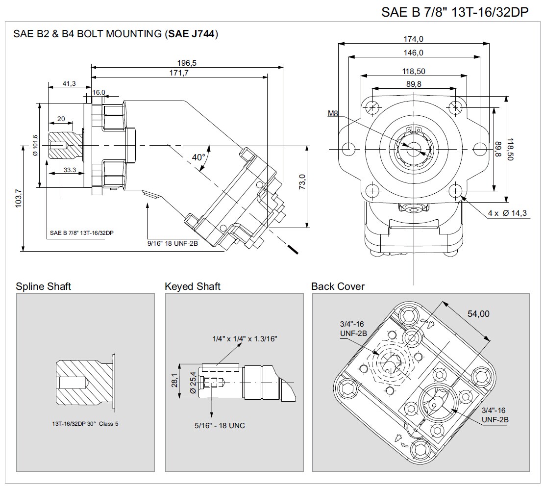BFPB系列斜軸柱塞泵,采用40度斜軸設(shè)計(jì),排量12cc-108cc,最高壓力可達(dá)400bar,SAE法蘭連接。具體參數(shù)及尺寸如下: